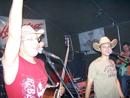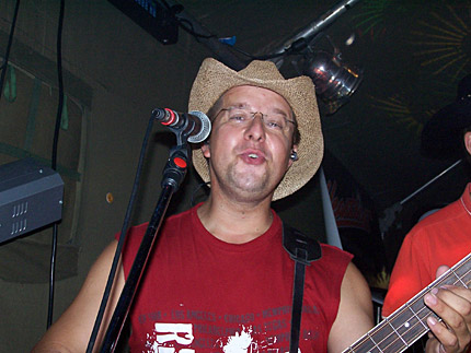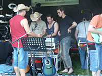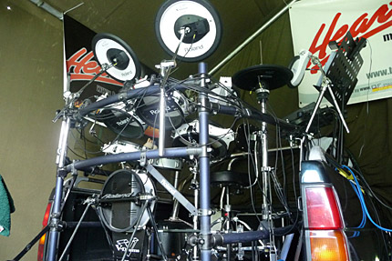 Konnte sich schon sehen lassen. Das Platzangebot war sehr beengt. Den Notenständer mußte er mit Gaffatape am PickUp festkleben. |
