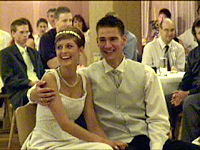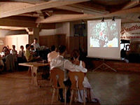 Die Freunde von Thomas und Caroline hatten einige Späße auf Lager. Links oben wurde über eine Videopräsentation das bisherige Leben der beiden beleuchtet. Oben sehen wir unseren Woiferl und seine Frau bei ihrer Einlage als Herbert und Schnipsi. Dem